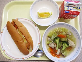 エッグチーズドッグ・牛乳・お肉と豆のトマトスープ・くだもの