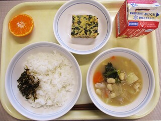 ごはん・韓国風ふりかけ・牛乳・ふくさ卵・豆豚汁・くだもの