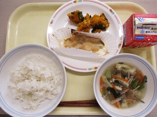 ごはん・牛乳・魚のゆずみそ焼き・かぼちゃのそぼろあんかけ・沢煮椀