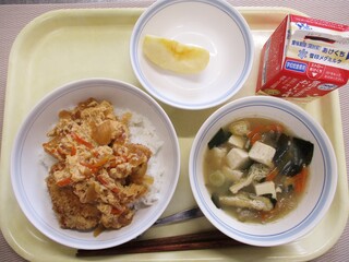 カツ丼・牛乳・根菜たっぷりみそ汁・くだもの(りんご)