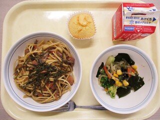 照り焼きチキンとごぼうのスパゲティ・牛乳・ブロッコリーと海藻のサラダ・オレンジケーキ