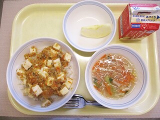 マーボー豆腐丼・牛乳・春雨スープ・くだもの(りんご)