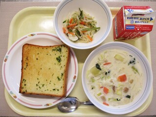 ガーリックトースト・牛乳・米粉のみそ豆乳シチュー・大根サラダ