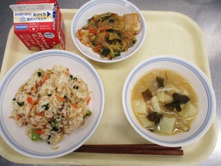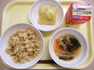 こぎつね昆布ごはん・牛乳・切干大根の卵焼き・呉汁