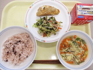 あずきごはん・牛乳・魚のごまみそ焼き・野菜の磯和え・めかたま汁
