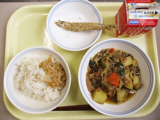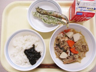 ごはん・牛乳・のりとひじきの佃煮・芋煮風煮物・ししゃもの磯辺揚げ