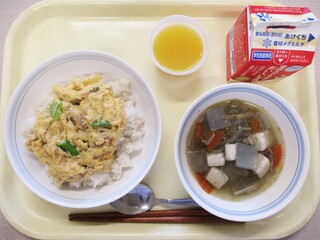 親子丼・牛乳・けんちん汁・オレンジゼリー