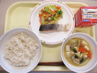 麦ごはん・牛乳・鮭の塩焼き・即席漬け・豚汁