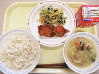 麦ごはん・牛乳・魚の塩こうじ唐揚げ・春雨の炒め物・呉汁