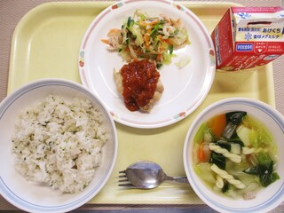 ごはん・牛乳・揚げ魚のチリソースがけ・春雨の炒め物・豆腐とわかめのスープ