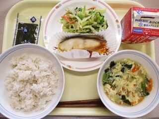 麦ごはん・牛乳・焼き海苔・魚の西京焼き・野菜のごま和え・かきたま汁