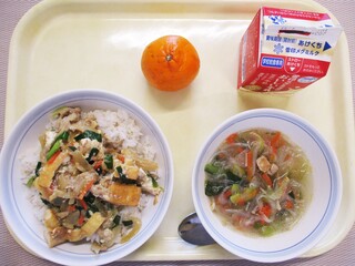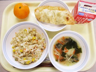 五目チャーハン・牛乳・野菜たっぷり揚げぎょうざ・トックのスープ・くだもの(みかん)