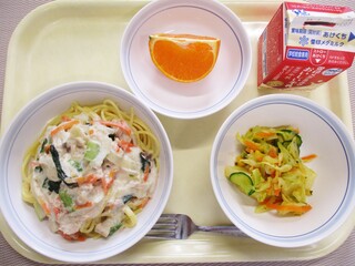 スパゲティクリームソース・牛乳・キャロットドレッシングサラダ・くだもの(せとか)