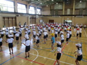 最後に、明日5日から5年生が伊豆高原移動教室に出かけることについて紹介がありました。5年生は、教室でリモート参加の朝会だったため、体育館や2・3年生の教室から5年生に向けて、みんなで「がんばれ!」と大きな声援を送りました。5年生の教室まで届いたかな?
