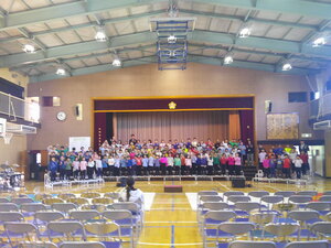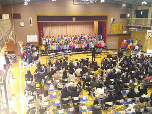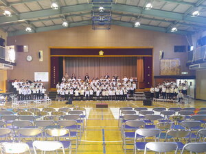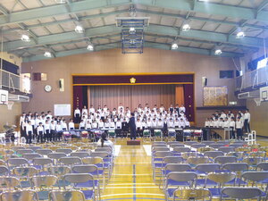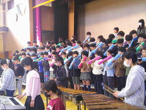 音楽の先生からは音楽会マナーについてお話があり、後半は全校合唱「Music」の練習をしました。練習といっても、全学年がそろって歌う機会はこの集会が最初で最後。心をひとつに、すてきな音色を体育館いっぱいに響かせました。