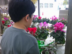 教員室前の棚に並んだシクラメン、おもに3年生が育てていることは以前お伝えしましたが、今その多くがうれしそうに咲いています。凛とした立ち姿が実に美しい。