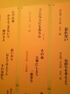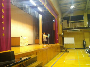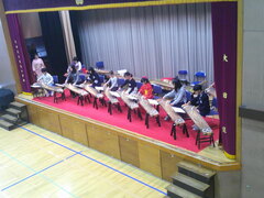 舞台の下で担任の先生がうれしそうに(ちょっと心配そうに)見守る中、心を込めてしっかりとお話をすることができていました。