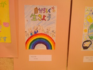 大田区立小中学校の代表の児童・生徒の作品(標語、毛筆、ポスター)が展示ホールに一堂に会し、なかなか壮観です。代表だけあって、クオリティもとても高いと感じました。中学生、さすがです。本校からも標語は6年生、毛筆は5年生、ポスターは4年生が、それぞれ2名ずつ出展しています。(下の写真では児童名の部分を加工しています。)