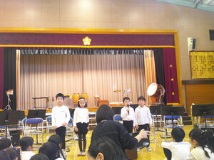オープニングを飾った1年生児童代表の「はじめのことば」、児童鑑賞日ならではの全校合唱、金管バンドの演奏、そして今日をじめくくった6年児童代表の「おわりの言葉」の様子です。