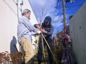 今日は、そのハナモモの樹名表示プレートが完成したということで、さっそく設置していただきました。