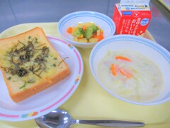 しらすチーズトースト・豆乳入りミルクスープ・カラフルサラダ