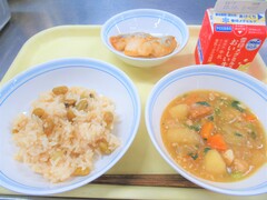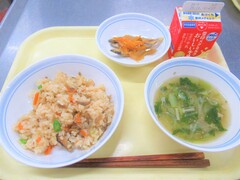 鶏ごぼうの中華風おこわ・きびなごの南蛮漬け・青菜とえのきのスープ