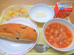 ぶどうパン・ポテトのチーズ焼き・ABCミネストローネ・くだもの(なし)