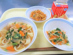 おっきりこみ・こんにゃくと野菜の和え物・南瓜と舞茸のかき揚げ