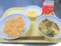 親子丼・ごまみそ汁・くだもの(りんご)