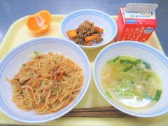 焼きそば・レバーとさつまいものごまみそ和え・青菜とえのきのスープ・くだもの(みかん)