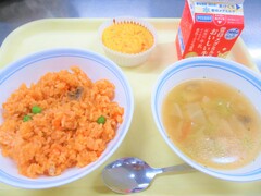 チキンライス・チーズ入りオムレツ・キャベツとジャガイモのスープ