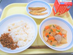 ごまごはん・かつおでんぶのふりかけ・わかさぎのからあげ・鶏肉と里芋のうま煮
