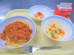 スパゲッティきのこミートソース・マセドアンサラダ・オープンアップルパイ