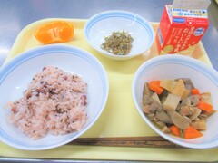 あずきごはん・筑前煮・田作り・かんきつ(ぽんかん)