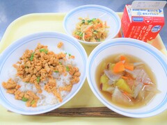 高野豆腐のそぼろ丼・ごまあえ・根菜汁