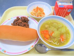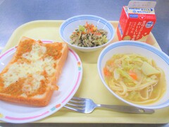 カレーミートトースト・ひじきとツナのサラダ・ヌードルスープ