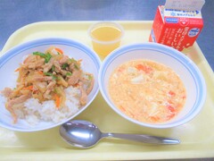 チンジャオロース丼・トマトと卵のスープ・アップルゼリー