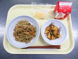 焼きそば・牛乳・大豆と小魚の変わり揚げ・くだもの(冷凍りんご)