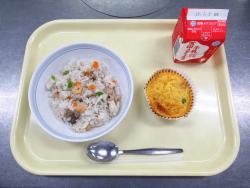 豆入り中華おこわ・牛乳・たまごスープ・くだもの(冷凍みかん)