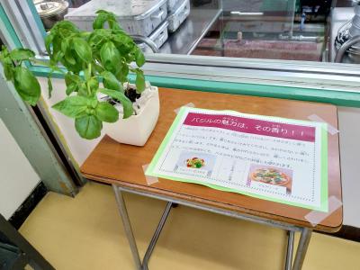 とうきょう元気農場からスイートバジルのサンプルをいただいたので、給食室の前に展示しました。