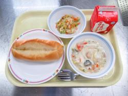 ソフトフランスパン・牛乳・マカロニのクリーム煮・ビーンズサラダ