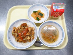 家常豆腐丼・牛乳・中華風大根・茎わかめの中華風スープ