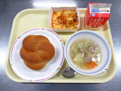 えびピラフ・牛乳・チーズ入りオムレツ・マカロニのトマトスープ