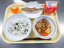 わかめごはん・牛乳・ししゃものごま焼き・麩入り肉じゃが煮・くだもの(はるみ)