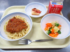 スパゲッティきのこミートソース・カラフルサラダ・オープンアップルパイ
