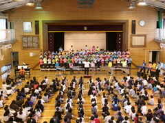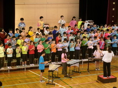 当日は写真撮影ができないので、事前に行った音楽朝会で全校児童の前で行った様子を掲載いたします。