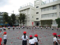 1、2年生は、運動会に向けて玉入れの練習をしています。曲に合わせてリズミカルに踊りつつ、笛の合図が鳴ると全力で玉を投げました。練習試合では、89対90という接戦の勝負となり、本番に向けて、「もっと1つ1つの玉を籠に向けて丁寧に投げたい。」「山のように投げて籠に入れたい。」などと声が聞こえてきました。(1、2年生担任)