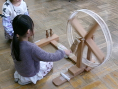 11月27日(木曜)1年生は、国語科「たぬきの糸車」の授業で糸車を回す体験をしました。