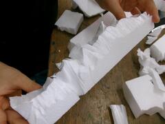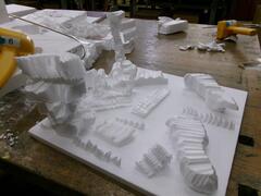 発泡スチロールを切って、できた形や形を組み合わせた感じから思い付いた世界をつくっています。
