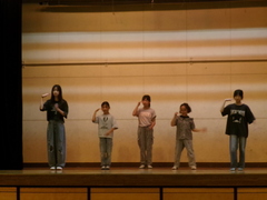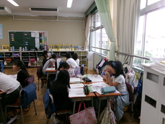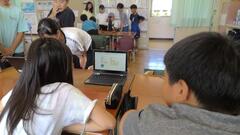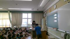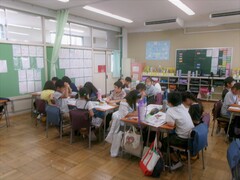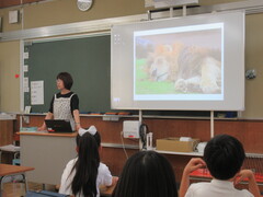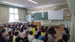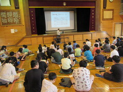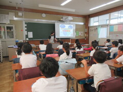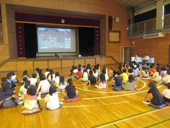 5年生のこどもたちがゲストティーチャーとなり、次年度に体験することになる伊豆高原移動教室について教えてくれました。写真がたくさん入ったスライドで、伊豆高原移動教室の楽しさがよく伝わってきました。積極的に感想を伝える4年生の姿も見られました。(4年担任)